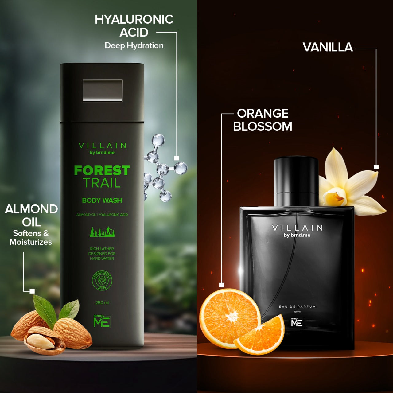 The Villain Classic EDP offers a timeless, masculine fragrance with top notes that exude confidence and strength, while the Forest Trail Body Wash refreshes your skin with its rich lather, crafted to combat hard water. Infused with almond oil and hyaluronic acid, it leaves your skin feeling smooth and revitalized, making this set a must-have for every modern man.