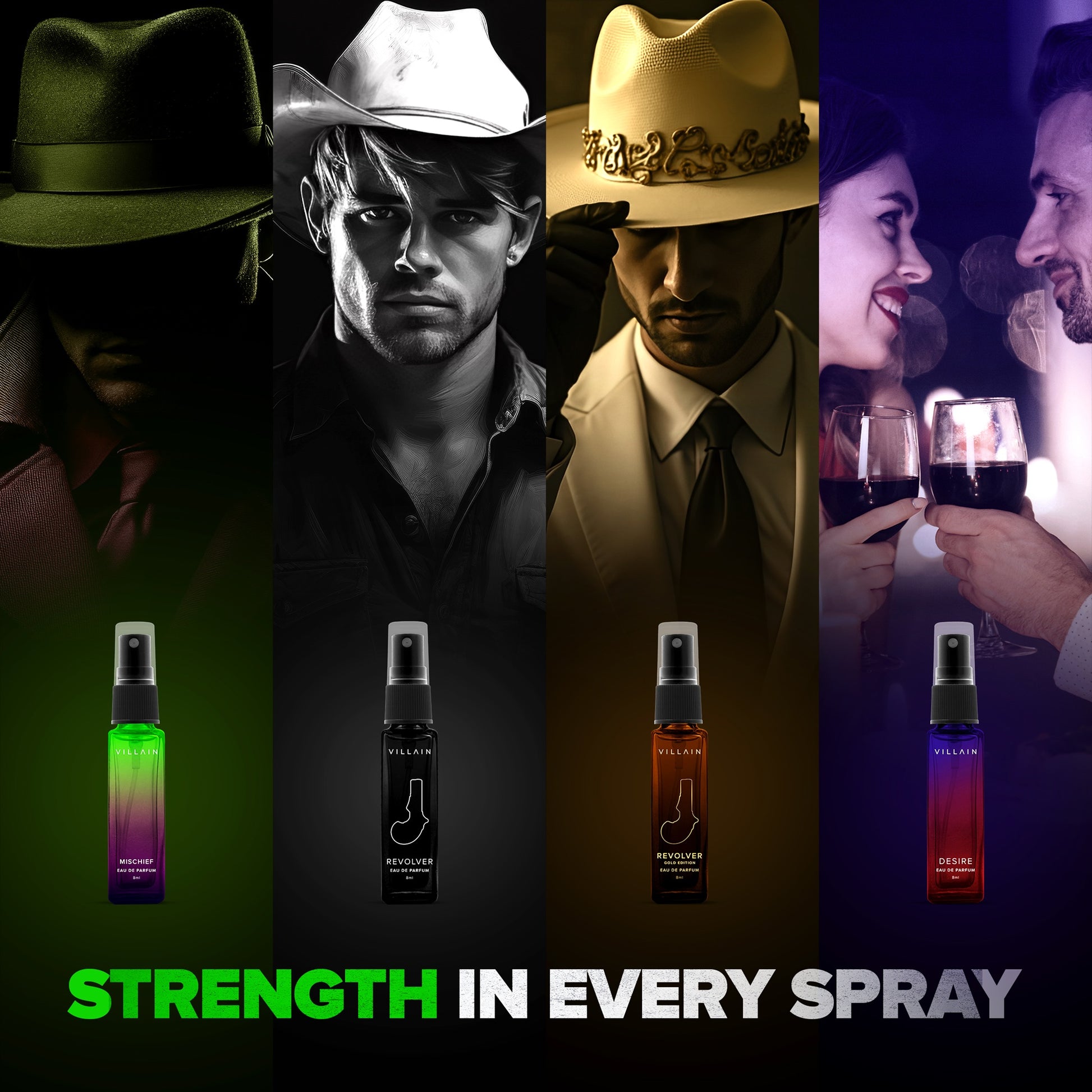 Feel the surge of strength and allure with every spritz. The Villain Raid Combo is designed for the man who commands attention. Packed with four bold fragrances, this set exudes confidence, magnetic presence, and undeniable character.