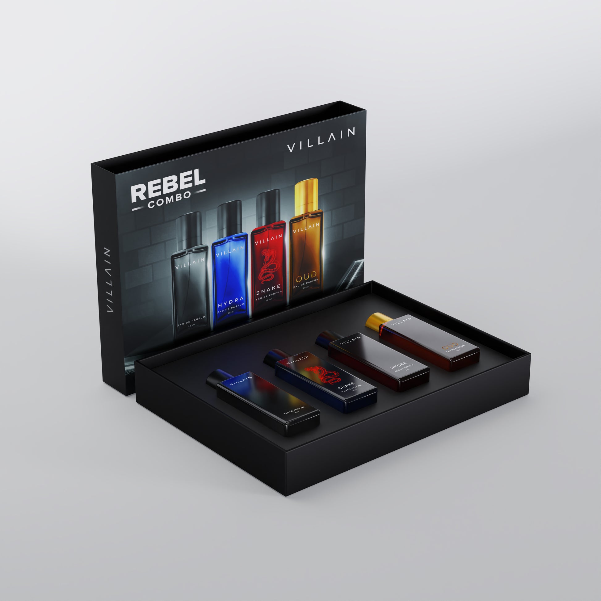The VILLAIN Rebel Perfume Combo is designed for the man who embraces boldness and confidence without hesitation. This gift set captures the essence of modern masculinity, offering four distinctive fragrances that speak volumes about your unapologetic attitude. Each fragrance in the set is carefully crafted to leave a lasting impression — from the fresh citrus vibes of Hydra to the deep, complex notes of Oud, this combo is your ultimate fragrance companion for every occasion.