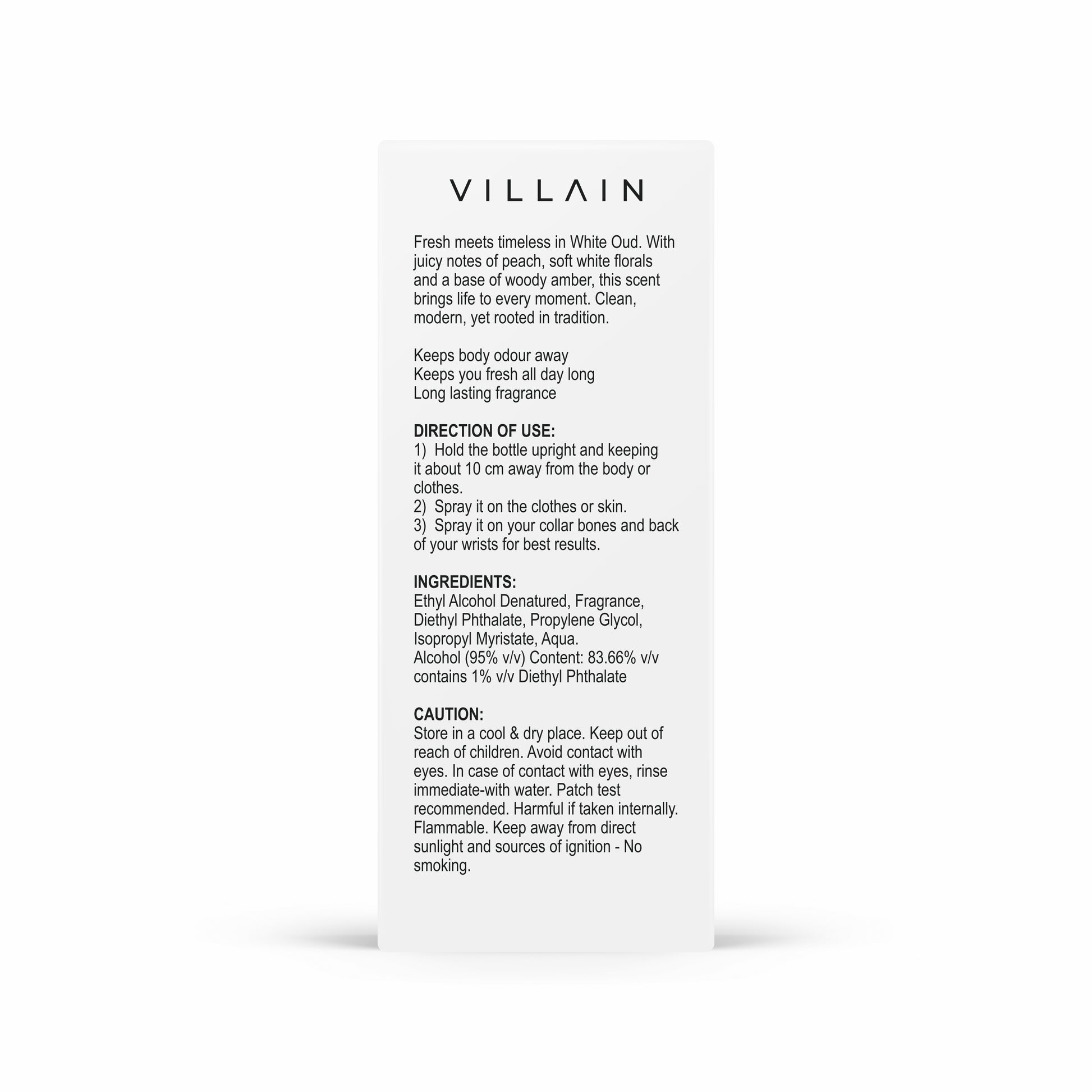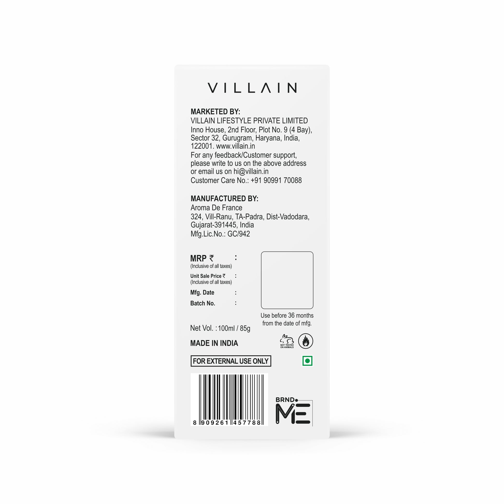Product Name: Villain White Oud EDP Brand Name: VILLAIN Common Name: Perfume EDP Manufactured By: Aroma De France Vadodara, Gujrat Net Quantity: 1 x 100 ml Use By: 36 months from date of manufacturing Product Dimensions: 8.5 x 4 x 9.7 cm Product Weight: 310 g Country of Origin: India